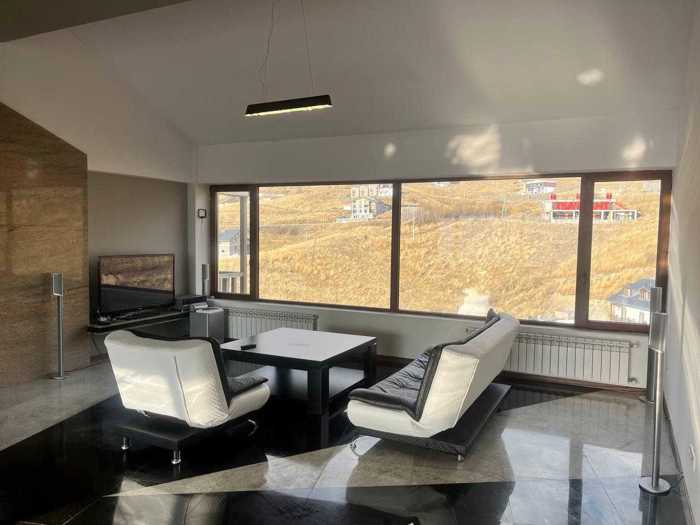 Penthouse for sale in Gudauri, near the Marco Polo hotel. Beautiful views, private sauna, furnished with appliances. The apartment is 237 sq. meters, with balconies on both sides and stunning views of the church. The apartment features a huge living room, two bedrooms, two bathrooms, and balconies. (Project change and addition of bedrooms are possible).