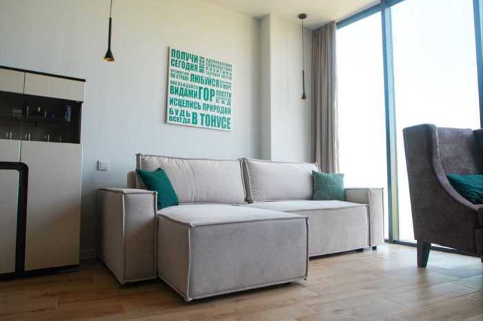 Apartment for sale by the sea, Kobuleti (Chakvi) Street: Khimshiashvili, 1 Area: 74.5 m² Format: 1+1 (bedroom + kitchen-living room) Balcony: 10.9 m² | Bathroom: 7 m² | Kitchen-living room: 35.1 m² About the apartment Lux layout with spacious kitchen-living room and built-in wardrobe in the bedroom Huge balcony area of 10.9 m² Large bathroom (7 m²) Panoramic windows Rehau 70 Modern materials: moisture and fire-resistant facade made of aluminum composite, ventilated foundation Fully gasified house, high seismic resistance Infrastructure Spa center, swimming pool, and sauna Modern fitness hall Children's playground Eucalyptus grove on the territory Ground parking Security and service Closed guarded area with video surveillance 24/7 apartment service Possibility of living year-round without additional agreements Completion date Construction completion - September 2025 Price: $92,500 ID ALS098
