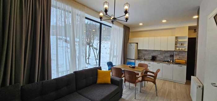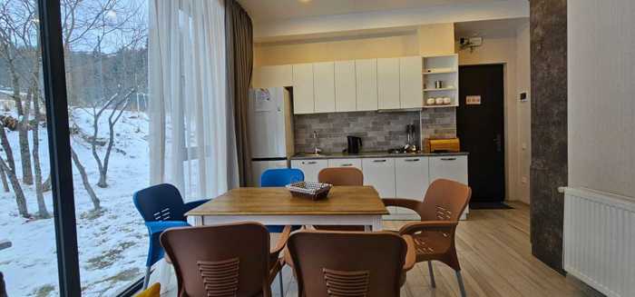 In Bakuriani, near the Didveli ski lift, a studio-type apartment of 34 sq.m. with a kitchen corner and a balcony is for sale in the hotel-type residential complex "Didveli Gallery". The apartment is renovated and equipped with furniture and appliances. Central heating/hot water/drinking water, internet/television are installed. There is an open terrace with panoramic views on the top floor of the hotel. The hotel has a restaurant, a closed parking lot, and concierge, security, and cleaning services available 24/7. It has an ideal location for both living and renting. It is close to the forest and ski tracks.