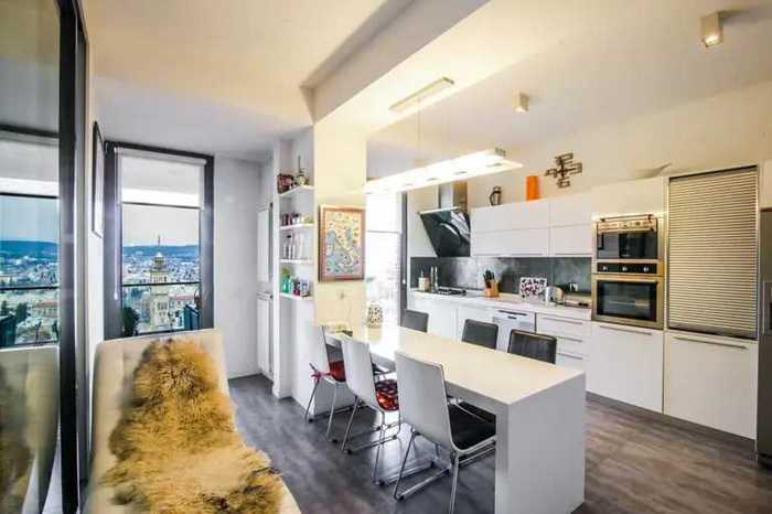 For sale on Kakabadze Street, at the highest point of Mtatsminda, an exclusive 220 sq.m. apartment with unforgettable panoramic views of Tbilisi. The apartment is located in a new building, on the 4th floor. The space is designed with comfort and aesthetics in mind. It features a huge, bright living room that is fully finished with large windows. From the living room, there is a direct exit to the balcony. The apartment has two bedrooms. Both bedrooms are equipped with their own wardrobe space. One of the master bedrooms additionally has its own bathroom. An additional advantage of the apartment is the garage. An ideal place for those looking for high-class living in a central but ecologically clean and quiet location. Price 790,000$ mob 596 108 883