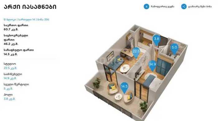 For sale: 2-room apartment in Mukhiani – Archi Jasmine Development Bright and promising 2-room apartment for sale in Mukhiani, in Archi Jasmine, Block B, a 10-minute drive from Akhmeteli Metro, in Archi Jasmine, 57.6 sq.m., at Gabashvili Street No. 1. The apartment is ready for renovation (green frame) with a beautiful and open view of the big church.