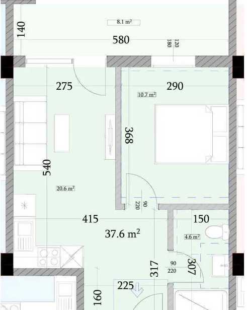 A apartment in the premium class residential complex is for sale in a green frame condition. Block A. The building has numerous additional benefits. A yard spread over 10,000 square meters, with an open pool, bicycle paths, and relaxation areas. An agrohub entry has also been announced for block A. Given its ideal location, the property is interesting for both living and investment! P.S. The floor plan has been made and you will be able to purchase the apartment through the public registry. We have also enlarged the bedroom space and a small corridor has been made in the entrance, which ensures a partial separation of the kitchen from the living room!