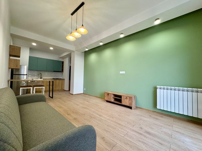 For sale is a 2-room, newly renovated apartment with furniture and appliances. The cozy and bright apartment with an area of 58.1 sq.m is located in Didgomi, on Teimuraz I Street, in the yard of Central Park, in a premium class newly built residential complex. The apartment stands out for its modern, tasteful renovation and is fully ready for living — as seen in the photos, everything stays. No additional furnishing is needed: a fully equipped bathroom with a washing machine, a comfortable and tidy bedroom, a large, bright studio with a built-in kitchen (refrigerator, dishwasher, gas stove, extractor), a built-in storage on the balcony, and a central heating boiler. One of the main advantages of the complex is the unique location — the building is located directly in Central Park, has a large enclosed yard, and parking spaces, providing maximum comfort and tranquility.