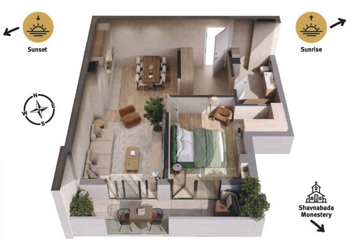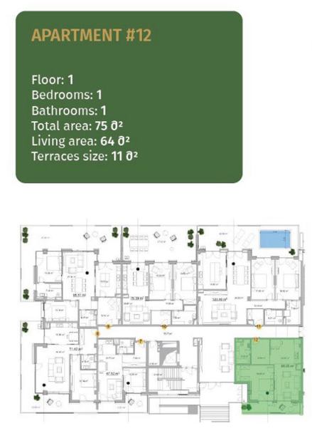 Apartment for Sale in Tbilisi Hills with a View of Shavnabada Monastery Apartment No. 12 Floor: 1 Bedrooms: 1 Total area: 75 m² — living area: 64 m² — balcony: 11 m² View: open view of Shavnabada Monastery, green area, no dense development Parking included in the price: — underground parking space No. 21 (valued at $12,500) — plus an additional outdoor parking space Contract price: $151,740 (including both parking spaces) Why this is a great deal Actual purchase price: approx. $2,176 / m² Current developer price: from $2,300 / m² At the current developer price, a similar apartment would cost approx. $159,850 and without an underground parking space The buyer gets a below-market apartment + two parking spaces Such conditions are no longer available from the developer Suitable for personal living, long-term rental, or investment Documents, floor plan, and details — available upon request