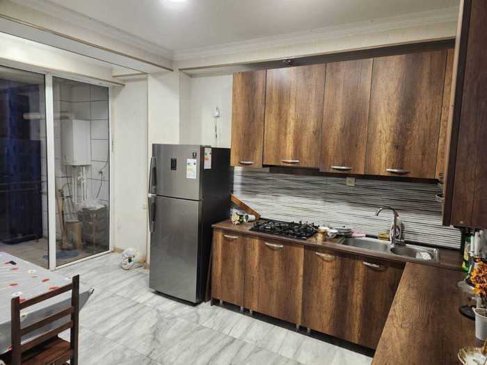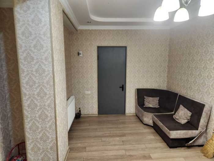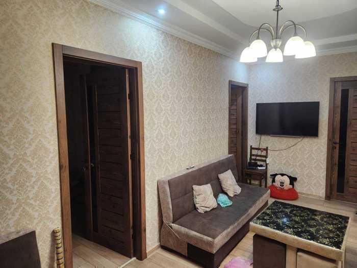 For sale is a 3-room apartment with old renovation, metal-plastic windows, new iron doors installed. The apartment includes built-in furniture, kitchen, gas stove, washing machine, air conditioner, and gas heater. The apartment has a basement and a small fruit garden.