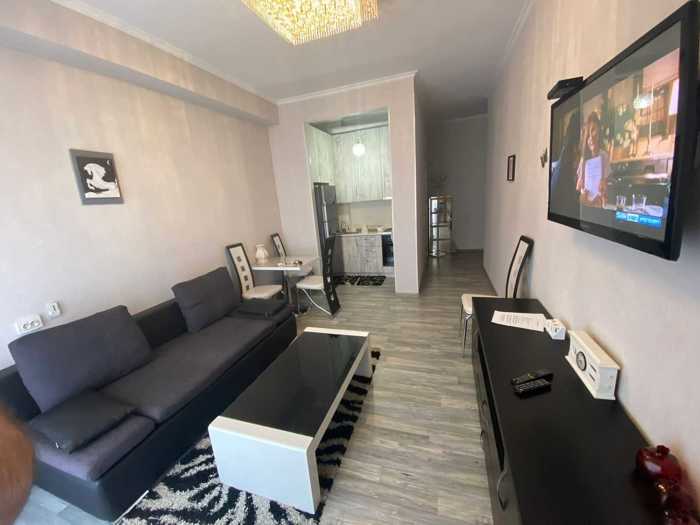 For sale is a bright corner apartment 3 minutes from the round garden, on Marabda Street, on the 1st floor of a newly built building. The total area is 80 m2. It is a studio type, with 2 bedrooms, a bathroom, and 2 balconies (12 m2). Built-in furniture and bedrooms remain at your request.