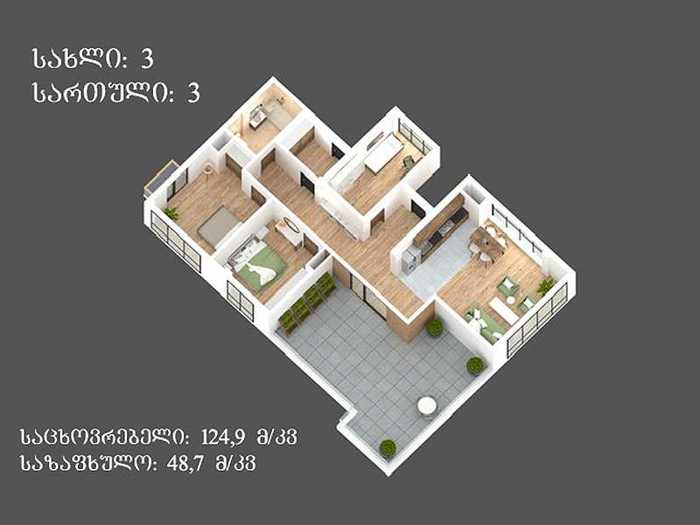 For sale in Krtsanisi a new built, handed over project apartment with a large veranda in a green frame condition. There are three isolated buildings, with an elevator and its own underground parking. Each apartment comes with 2 parking spaces. It is possible to choose a floor according to the layout; this is the smallest apartment. Contact me for details.