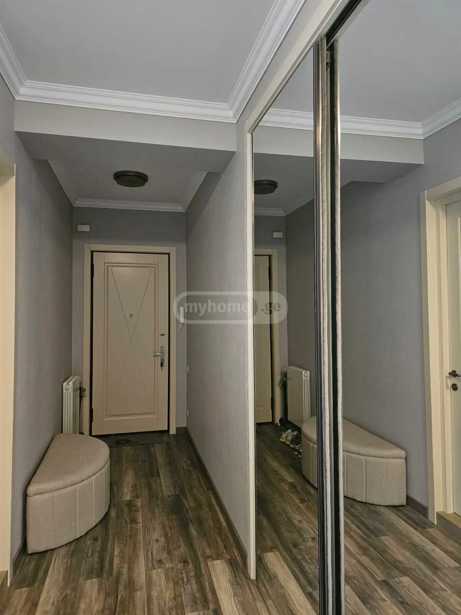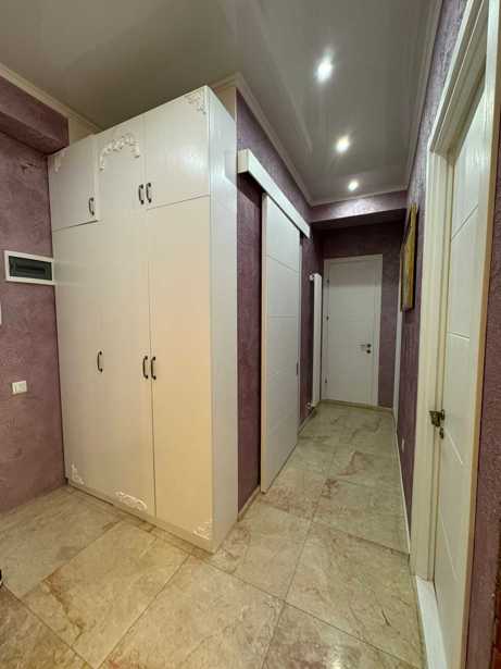 I am selling my house, a newly built apartment, renovated in light colors. With the best materials: marble flooring, parquet installed in the bedrooms, Venetian painted walls, Grohe plumbing, Italian heating system, custom-made furniture, everything stays. There is also a separate dressing room. The apartment is located at the beginning of the second plateau of Nutsubidze, actually on Nutsubidze Street. There is a shop, pharmacy, school, kindergarten, Vaja-Pshavela metro nearby, and a view of the whole Tbilisi, even the mountains and Sameba can be seen. We did everything for ourselves; we are selling because we need to expand.
