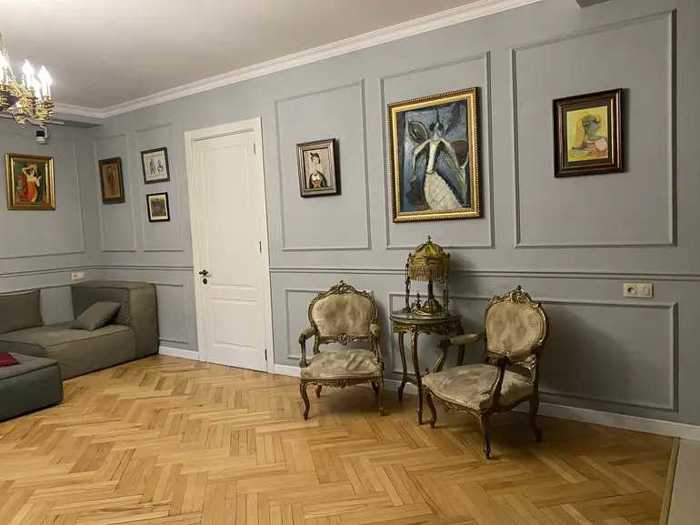 For sale is a high-ceilinged corner apartment with a pass-through near the round garden. Newly renovated, with top-quality materials, premium class appliances. Central heating, 2 air conditioners, wooden parquet. Three bedrooms, 2 bedrooms have their own wardrobe, 1 bedroom has a large built-in closet. With 2 balconies, 2 bathrooms, secured entrance, 2 elevators - freight and passenger. The yard is closed with a barrier and has a parking space. Some appliances and furniture remain.