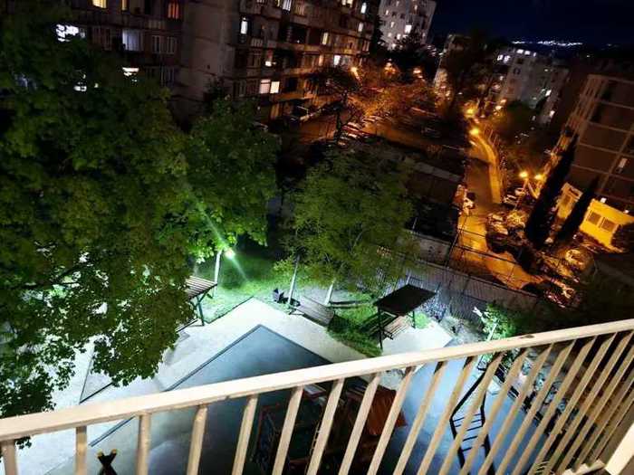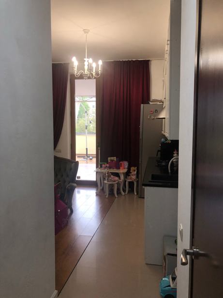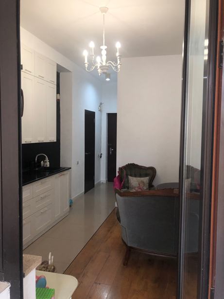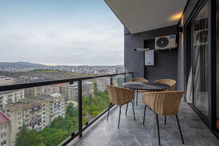 For sale is an apartment in Vake, on Kipshidze Street. A 2-room studio-type apartment (combined kitchen and living room, 1 bedroom, 1 bathroom, and a large balcony). The total area of the apartment and balcony is 72.50 sq. m., of which about 40 sq. m. is a veranda (balcony), it is possible to close the balcony and add more rooms. There is a large closet and a retractable sunshade umbrella on the balcony. With aluminum doors and windows. Equipped with Otis elevators, marble entrance, locked entrance, video cameras, security, barrier.