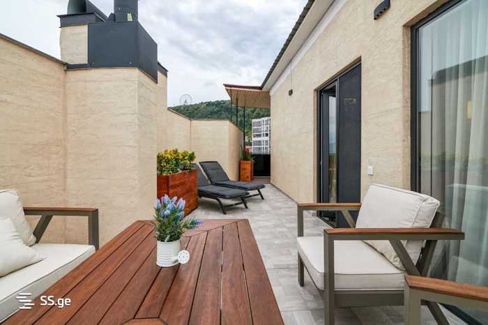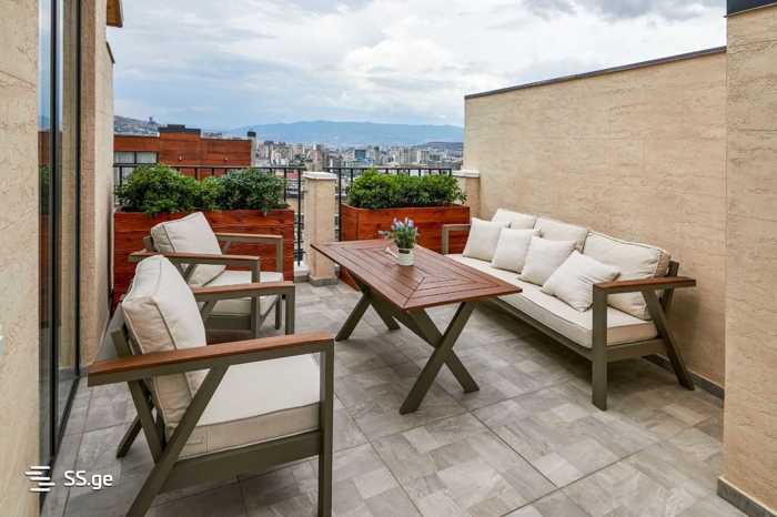 Penthouse for sale in Vake... Location: Shatberashvili St. (5 minutes walk from the Round Garden). Key details: Area: 300 m² (220 m² interior + 80 m² terrace and balconies), Rooms: 6, Bedrooms: 4 Floor: 9/9 (penthouse), Advantages: Stained glass windows, beautiful views of Tbilisi, dimmer lighting system, functional fireplace and bar section, huge wardrobe, jacuzzi on the terrace, greenery with electric irrigation system, 2-space underground parking. High-quality furniture from Mfactory and Saloni (Istanbul) Two-story layout: First floor: isolated kitchen, bedroom, guest bathroom, large living room, Second floor: bedroom area, large master bedroom, wardrobe, large bathroom, large terrace with jacuzzi..