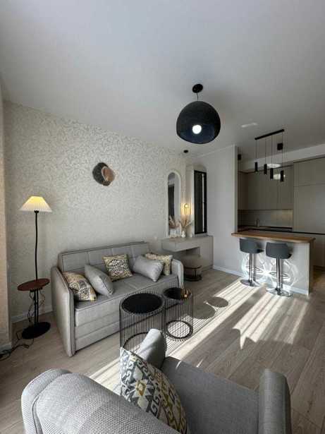 |For sale is a cozy and bright corner apartment in Temka, on the 9th floor of a newly built 18-story building. The apartment has 2 bedrooms, a large living room, and a separate kitchen. There are also 2 balconies, one for the large bedroom and the other for the living room. The apartment is sold with appliances (except for the TVs) and furniture (as seen in the photos).