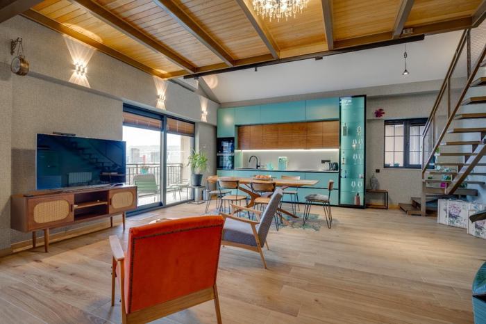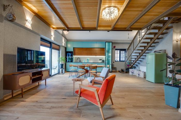 A 4-room non-standard apartment with an attic is for sale on the Tsqneti highway, on the 16th floor of a new building. The total area is 157 m2 and includes a studio-type living room and kitchen, 3 bedrooms, 2 wet rooms, and 2 balconies (15 m2). The apartment has been newly renovated.