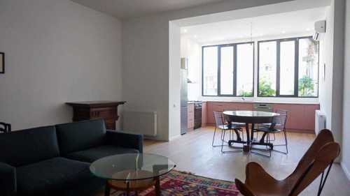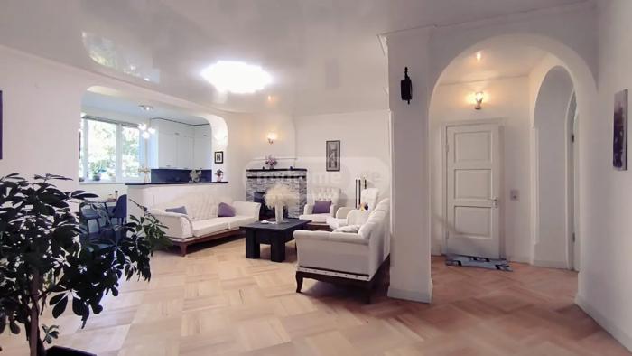 Newly renovated 3-bedroom apartment at 79 Uznadze str., near the Marjanishvili theater, in the so-called "Stalinka". The apartment is bright, sunny, all rooms have primary lighting. There are parking spaces in the fenced yard. The yard is greened with perennial trees, where there is a children's playground/space. The apartment has a balcony and a fireplace. It is possible to register an attic of the same squareness. The apartment has built-in wooden cabinets, kitchen and built-in appliances