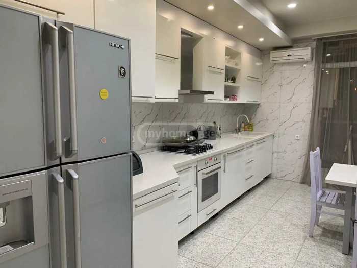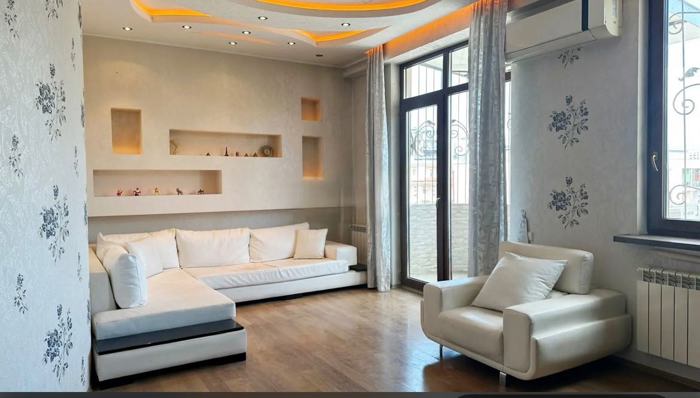 For sale: a 3-room apartment with furniture, all rooms with natural light. A wardrobe room, a separate kitchen, 2 bathrooms in a newly built building by Axisi on Tsintzadze Street.