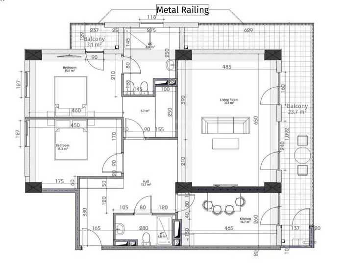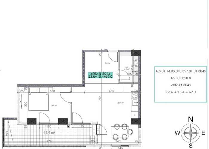 For sale is a 55 sqm two-room apartment with a green frame. In a newly built completed building. The building is 100% occupied. The building is located at 3, I Dead End of Petre Kavitadze, behind the Café House. The apartment is for sale with a 14 sqm parking space. The price of the parking space is $12,000.