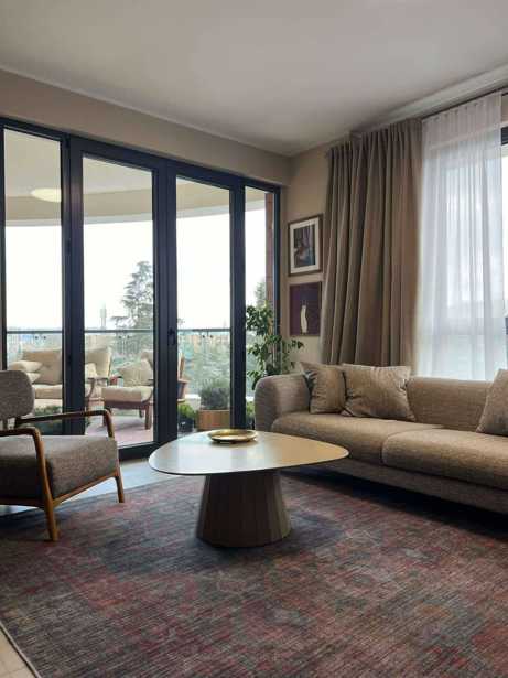 We offer a unique apartment in Tbilisi Gardens — a premium-class living space with modern design, high-quality renovation, and panoramic views of the city. The apartment is an ideal choice for those who appreciate comfort, an environmentally friendly atmosphere, and refined style. Among the advantages of Tbilisi Gardens is its eco-friendly and prestigious location, which is ideal for living. The building is constructed according to international safety standards and offers panoramic views of the mountains and the city. The complex includes 21,000 m² of green areas, a central park, and modern infrastructure facilities. It also features a 25-meter swimming pool, a fitness center, and a play area for children. Security is ensured by 24/7 surveillance and a video monitoring system. The advantages of the apartment include premium renovation carried out with top-quality materials and modern design, fully compliant with international standards. The interior is furnished with premium furniture from Motif and Naterial, Italian Flos chandeliers, and modern electrical systems from Legrand. The elegant decor by Jonathan Adler adds special sophistication to the interior. The apartment is fully equipped with Bosch appliances, including air conditioners, a refrigerator, ovens, a microwave oven, a gas stove, washing and drying machines, a hood, and a wine cooler. The kitchen is professionally arranged and consists of kitchenware from Zwilling and Alessi, as well as a coffee machine from Delonghi. For vital comfort, the apartment is equipped with a Harman Kardon audio system, which provides a high-quality musical experience, while part of the interior also features a mini collection of premium beverages.