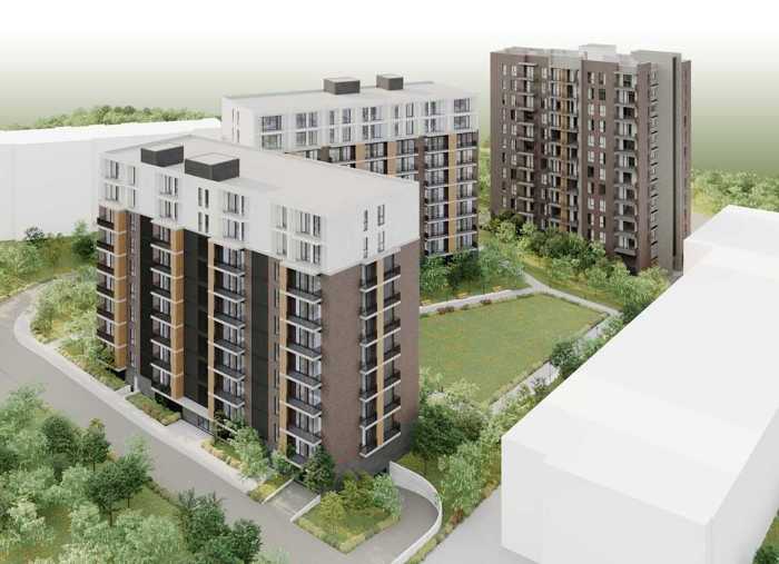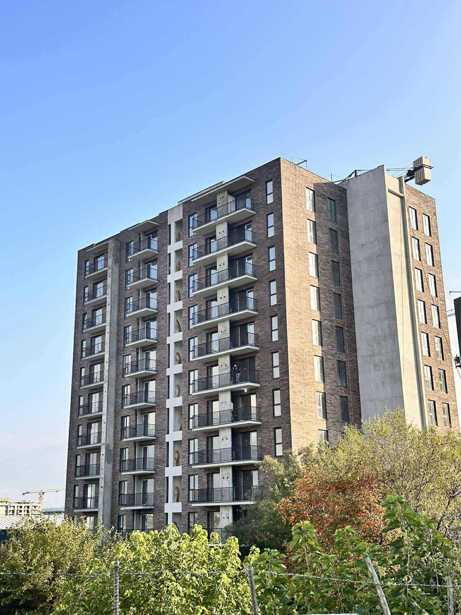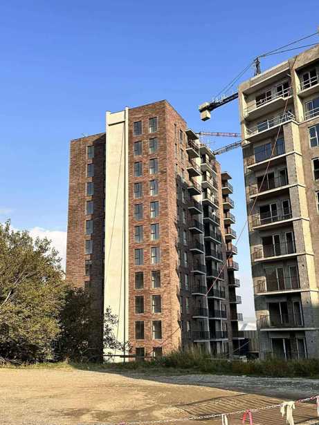 For sale, under the condition of a green frame, on Demetre Tavdadebuli Street. A view in a building constructed by a developer. The finishing of the facade and entrances is in progress. Electrical work and plumbing are being done in the apartments. Renovation can begin already.