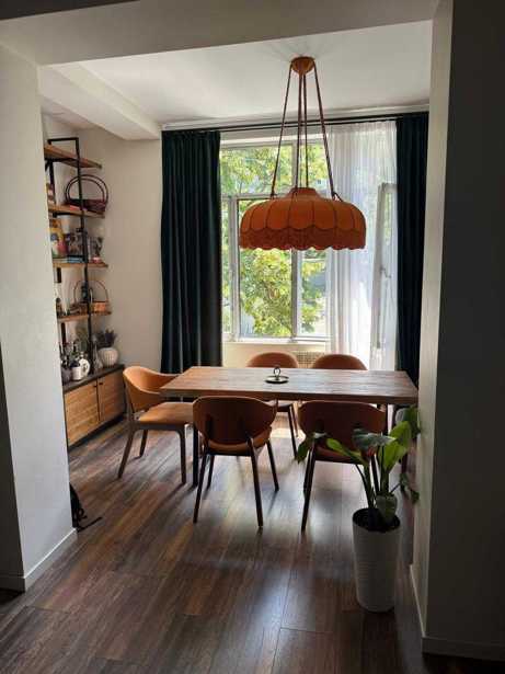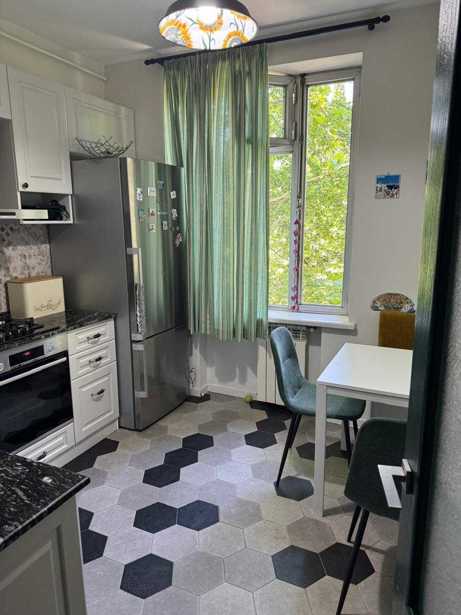Three-story 177 sq.m. apartment with original artistic design. The apartment is through, with eastern and western lighting. 6 rooms (4 bedrooms, 1 dining room, 1 living room), kitchen, two bathrooms, two balconies, a veranda, two dressing rooms, and a pantry. The apartment has its own basement. The house has an elevator and parking in the yard. The apartment comes with built-in wardrobes, library shelves, and kitchen furniture.