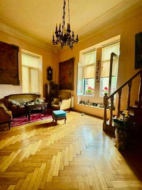 A unique apartment for sale in Old Tbilisi, on Leonidze Street, near Freedom Square, on the third floor of an old capital house. The apartment is very bright, spacious, with views, and high ceilings. The apartment has three bedrooms, three full bathrooms, Canadian oak parquet, fireplace, modern kitchen with Bosch appliances, two walk-in closets, air conditioning, central heating, hot water tank, and a veranda. The apartment will retain built-in wardrobes, appliances, dining tables, and beds. The price is 455,000 USD.