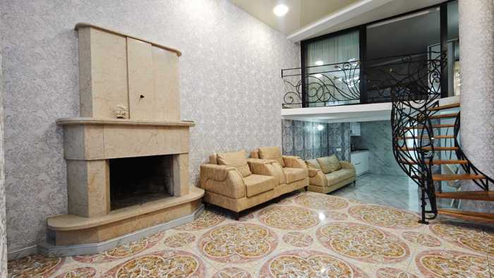 For sale is a 9-room apartment (with attic and basement) in the center of Batumi. The apartment is fully renovated, with central gas supply, and features expensive oak parquet flooring. It has four bedrooms, three of which have their own wardrobe rooms, and each bedroom has its own balcony. The living room and library contain fireplaces, a separate laundry and storage room, two large bathrooms, a veranda decorated by an artist, walnut doors, a stained glass window in the hall painted by an artist, built-in cabinets in the library, air conditioning in every room, and a central electrical stabilizer. Along with the apartment, a 400 sq.m attic and a 20 sq.m basement are also for sale. The apartment occupies the entire floor of the building, and the entrance area is isolated.