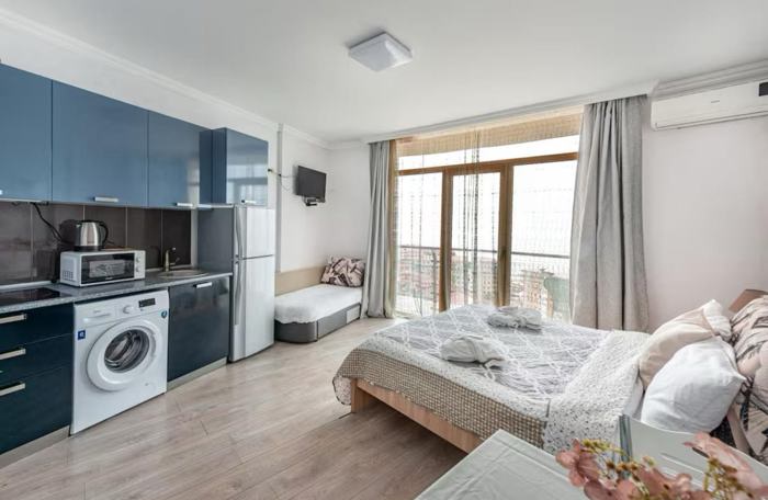 Studio with Sea and Sunset View – Orbi Residence. A cozy studio is for sale in the ORBI RESIDENCE hotel and residential complex. The balcony offers a beautiful view of the sea and sunset. The studio comes fully equipped with furniture, household appliances, and internet. Built in 2014 by Orbi Group, this 27-story building features a unique wave-shaped design. Located on Kobaladze Street, it's just a two-minute walk to the beach. Building amenities include 7 elevators, reception, security, video surveillance, parking, and commercial spaces. The well-maintained area is ideal for both permanent residence and vacation stays. Nearby attractions and facilities: aqua park, boulevard restaurants, cafes, Metro City shopping center, Batumi Mall, Black Sea Mall, shops, and supermarkets. The area also has schools, hospitals, maritime school, and university. Maintenance cost for Orbi Residence (elevator and common areas): 240 per year when paid annually (20 per month), or 25 per month when paid monthly.