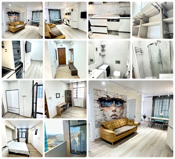 #For sale new apartment (1+1) 53.4 m2 in the BLUE SKY complex, with renovation and premium furniture and appliances. Block A. The complex is scheduled to be completed in September 2025. BLUE SKY is a multifunctional premium-class complex located in Batumi, at 14 Shartava Street, 250 meters from the sea. The BLUE SKY complex includes a casino; bowling entertainment center — entertainment areas for children; technical service; reception and concierge services; high-speed elevators. The apartment is located on the 28th floor with a view of the sea and Heroes' Alley. The apartment is rented with expensive appliances and furniture. Nearby is the UEFA football stadium. Excellent location on Heroes' Alley, the entire alley is within walking distance. The most touristy place in Batumi. Restaurants, pharmacies, banks, Carrefour supermarket, and Batumi Mall are within walking distance — a promenade alley to the beach to the singing fountains. It can be purchased with a mortgage, call or write WhatsApp