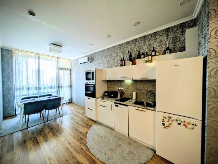 Comfortable apartment in Calligraphy Towers in the central area of Batumi. Guaranteed view of Hero Square, the stadium, the sea, and the mountains. New renovation, all necessary appliances for comfortable living: dishwasher, oven. Air conditioners in every room. One room is small, without a window, but there is ventilation. Close to shops, cafes, pharmacies, and public transport stops. Only a 10-minute drive to the sea. Excellent option for living or long-term renting.