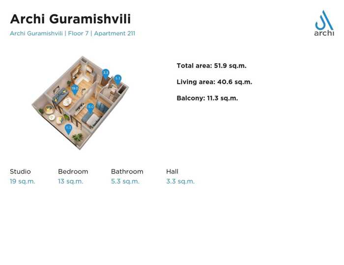 Apartment for Sale in Archi Guramishvili Project – Tbilisi Handover: September 2026 An apartment for sale in the modern Archi Guramishvili project. The building is currently under construction, with official handover scheduled for September 2026. Apartment Details: Floor: 28 out of 32 Total area: 51.9 sqm Handover condition: Premium Frame Price: 60,000 USD Area Distribution: Bedroom: 13 sqm Living room: 19 sqm Bathroom: 5.3 sqm Entrance hall: 3.3 sqm Balcony: 11.3 sqm View & Photos Clarification: The photos shown in this listing are of the same apartment layout on the 11th floor. Access to higher floors is currently restricted due to Archi’s strict safety regulations, which do not allow visits to upper floors (including the 28th floor) until full project completion. The structural construction of all floors has already been completed. The project is now in the finishing stage. The offered apartment is located on the 28th floor, providing a significantly better panoramic view overlooking: The internal courtyard of the project The river The main Didi Digomi road Price Advantage: The price is significantly lower than the current price offered directly by Archi Sale Conditions (Important): Cash payment only – one lump sum (no installments) No cooperation with banks or financing companies Sale due to travel reasons only Cooperation with real estate agents is welcome For more information or to arrange a meeting, please contact me directly.