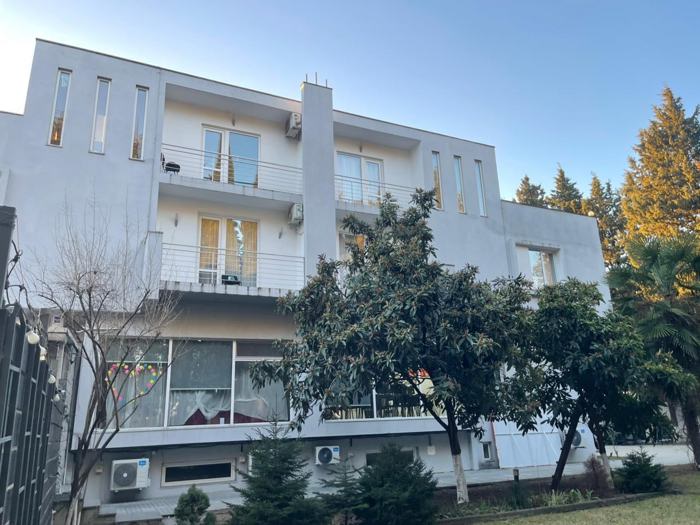 Land area: 1700 sq.m (200 sq.m to be registered) There are two independent residential houses in the yard. Main building – a complex of townhouses • Two independent townhouses (currently combined) can be separated again • Individual entrances, yards, and gates are independent • 4 floors • 10 bedrooms | 12 bathrooms | 24 sleeping places • Each bedroom has a balcony • Additionally, 2 large terraces • Bedroom area: 22–35 sq.m • Built-in wardrobe spaces On the first floor, there are two separate living rooms, 2 bathrooms, and a kitchen area. The minus 1 floor has daylight and two additional bathrooms. The building is fully renovated and equipped with modern heating and cooling systems, each townhouse having independent technical communications. Additionally, the complex is connected to a separate dining-kitchen of 120 sq.m, equipped with industrial equipment.