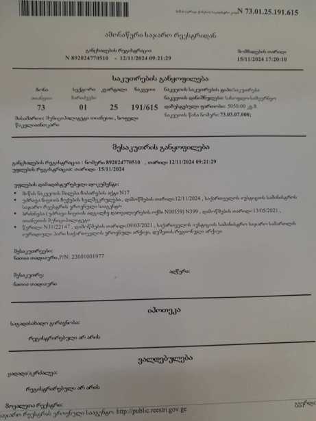 Area: 2,500 m² Location: 8 km from Tianeti district center, village Zaridzebi Altitude: 1,100 m above sea level. Price: 11 $ / m². Total cost: $27,500. Unique features: ✓ Cool climate in summer. ✓ Remote from the city, but accessible location. ✓ Ideal for homestead construction.