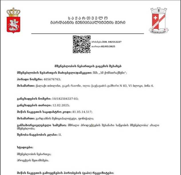 The land has changed status from agricultural to non-agricultural, a project for a 350m2 building has been approved, suitable for both dry storage and ideal for preventive measures. It has an access road from the Tbilisi-Rustavi highway and is located 100-150 meters away, making it an ideal place for commercial activities.