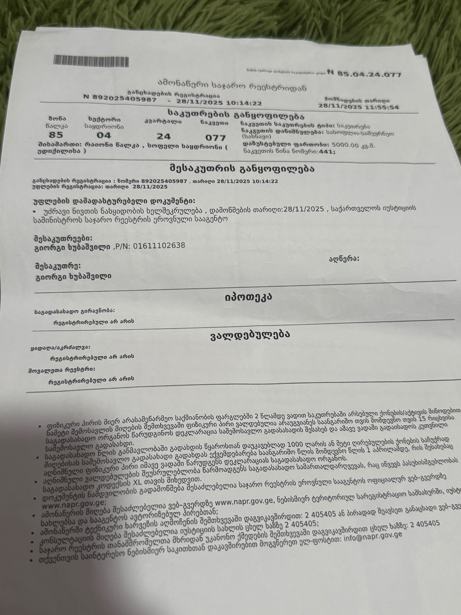 Land is pawned in Saguramo for 5000. Paying 200 dollars monthly. The owner will pay off the amount in advance. It will be formalized at the notary in the Justice House