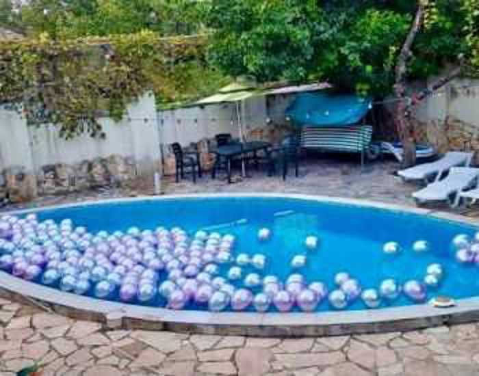 A cottage is for rent in the center of Saguramo (turn near Nikora store). The pool is heated. It accommodates 20-25 people. A stay of 10 people is allowed. There is a separate space designated for events (celebration room of 45 sq.m)