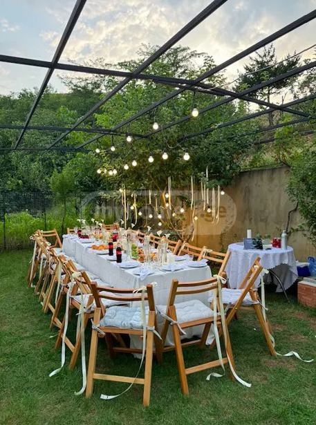 The house is located at the entrance to Tbilisi from the Mtskheta side, at the beginning of Agmashenebeli Alley, in Mukhatgverdi Cottages. We have no restrictions on music, you can use the 1000-watt Beringer speaker all night long. It is forbidden to bring additional speakers. The house has 3 bedrooms, a living room, a kitchen, an indoor pool that is heated to 38 degrees, we have a large dance hall with club lights, tables and chairs for up to 50 people. There is also a large, beautiful, green yard, parking spaces in the yard, a grill and skewers for barbecue and a huge terrace. You can enter from 3 pm, and the exit time is determined by 12 am the next day. The price varies depending on the days of the week and the number of guests. Reservations are accepted in advance. You can preview the house, both through a detailed video and on site.