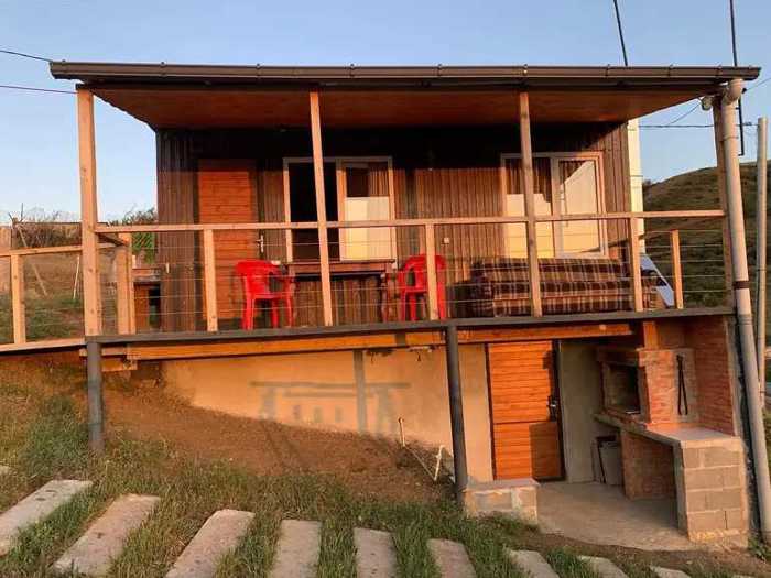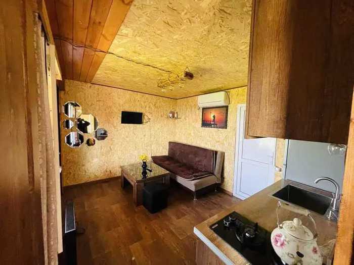 A large living room, two bedrooms, kitchen, and bathroom separately. Refrigerator, Wi-Fi, large speaker, hot water, central heating. There is a large yard area of 1300 sq.m., comfortable and tidy environment, there is a gazebo, table, and chairs in several locations where it is possible to organize buffets, parties, and other similar events. Price is 350 GEL.