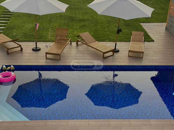 For rent: a private house in Misaktsieli. Newly built, with modern architecture. The house includes 4 bedrooms, 1 kitchen, 1 living room, and 3 bathrooms. Porches, a swimming pool with a gazebo.