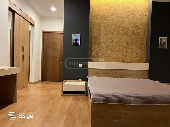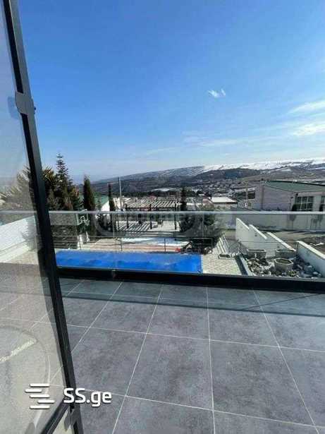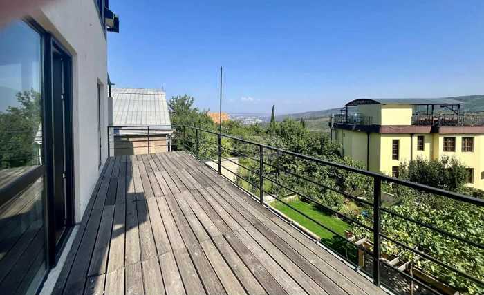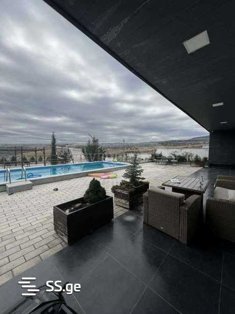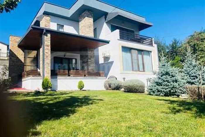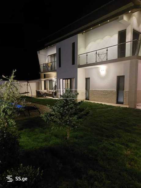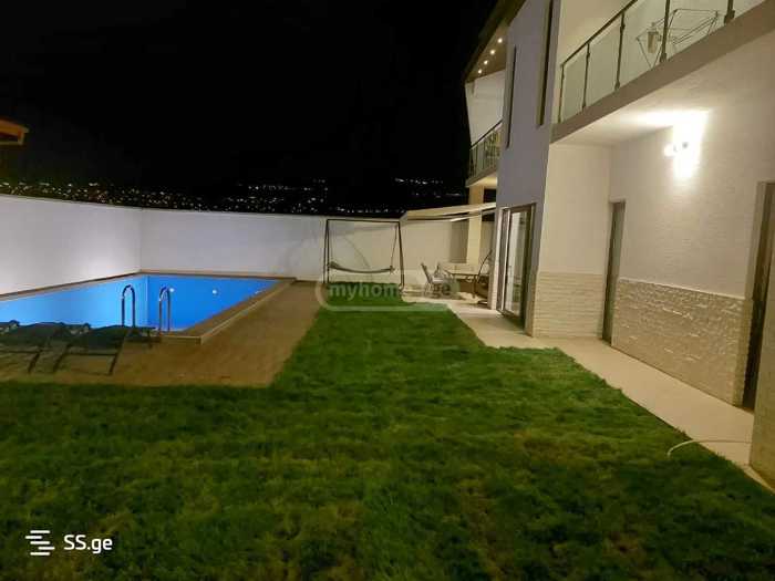 For rent, a 300 m² private house and a 1000 m² green yard, on Amaglebis Street, Okroghana, Tbilisi. Newly built, with a pool, modern design. The house has 5 bedrooms, 3 bathrooms, and a large living room with a fireplace.