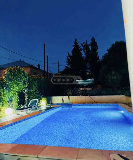 For rent is a 180 m² private house on Ekaterine Baghdavadze Street, in Tskhneti, in an ecologically clean and safe environment, close to the city. The territory has 24/7 security, landscaping, and cleaning services. The house features an isolated kitchen (+ pantry), a living room with a working fireplace, 4 bedrooms, and 3 bathrooms. There is access to the terrace/backyard from every room. The yard has a brick-laid grill oven and an artificial waterfall made in Japanese style. The yard is very green with many types of decorative plants.