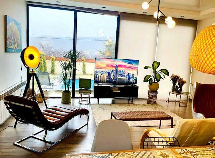 Living area of 160 square meters (with large and spacious windows) And the yard is 750 square meters. There are six rooms in total, including a technical room. Three of them are bedrooms (one with a bathroom). Includes a swimming pool (7/3), fireplace, and two bathrooms. The house is equipped with an Italian heating system, expensive bathroom and kitchen appliances (BOSCH, SAMSUNG, PHILIPS), and valuable furniture in the dining area and yard (KARE). The expensive yard is landscaped with evergreen trees, which are watered by an automatic irrigation system. Cold and hot water is always available, as the house has its own autonomous water supply system. The gate operates an automatic system via remote control. The yard is fully and well-lit. The lighting system works automatically. The size and layout of the outdoor space allow for hosting a significant number of guests. The yard is surrounded by a solidly built and decoratively covered fence. The gate operates an automatic system via remote control. Green lawns and plants are watered by an automatic irrigation system. The yard is fully and well-lit. The lighting system works automatically. 📍Saguramo (Kotoran Takari). With a view of the Caucasus. Right next to the central paved road (You won’t have to turn anywhere and won’t have to reach the house via a rocky road, as is the case with most houses in Saguramo)