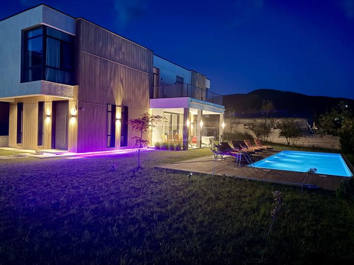 A modern house for sale with a pool, renovated and furnished. With beautiful views. The pool is 12x4, heated. 5 bedrooms + living room. Underfloor heating. Energy-efficient walls with insulation. With a garage and parking for 6 cars. Various fruit trees. The house area is 280 sq.m, the land area is 1500 sq.m. Automatic irrigation system. Fully equipped with smart home features. The house is located a 5-minute drive from the center of Saguramo, in the village of Bichmendi.