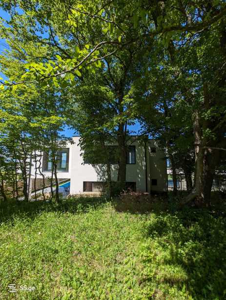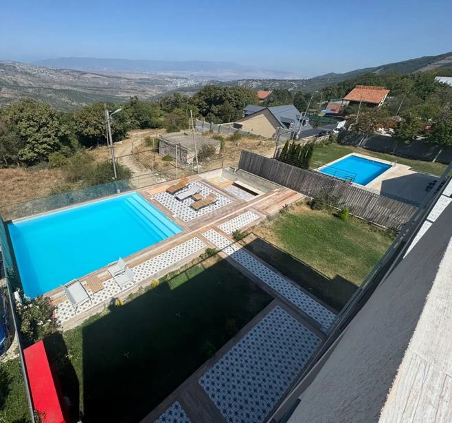Bethania II, on Pirosman street. 01.81.28.064.002. Bethania settlement II, 2 km from the ski trail turn. House with a view of Tbilisi. Land 572 sq/m. Pool 47 sq/m. Total residential area 240 sq/m + balconies area 114 sq/m (80 sq/m veranda), parking for two cars 43 sq/m, yard landscaping 230 sq/m. 3-story house. 6 bedrooms, 4 wet points. On the third floor, a conservatory and sports gym area. Doors and windows with German aluminum and energy-efficient glass. Under the pool there is a washbasin and a 50 sq/m technical room. Central heating (floor heating in the first floor and in bathrooms). Built with 30 blocks and insulated with XPS. The facade is lined with Georgian brick. 2 boilers (for the pool and heating).