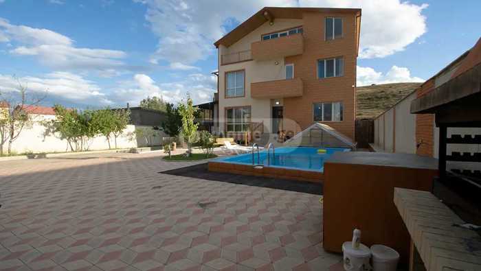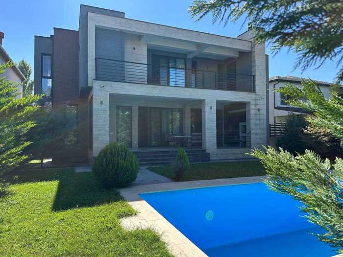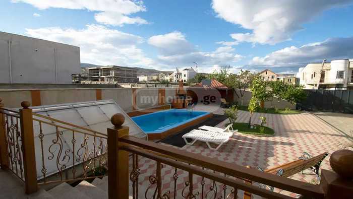 A house is for sale in the village of Digomi, Khataeti Street 172. 400 sq m of land. The area of the house is 216 sq m. m. Pool: 6.5 meters long and 3 meters wide. 3 bathrooms, 4 rooms on the second floor, and 1 on the first floor. There is a black frame.