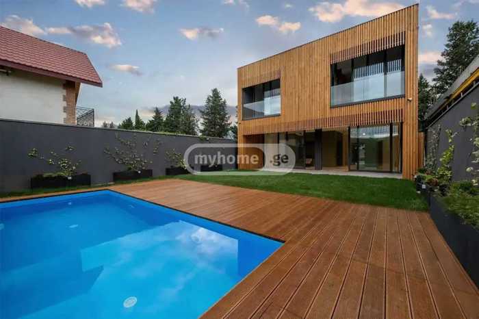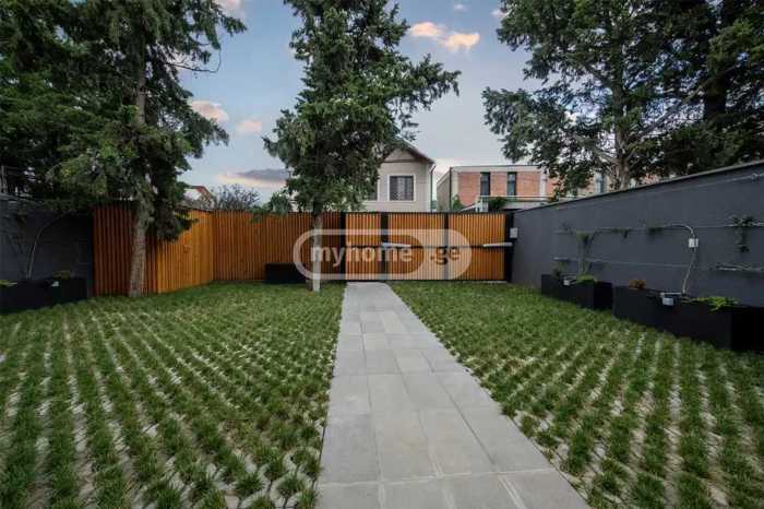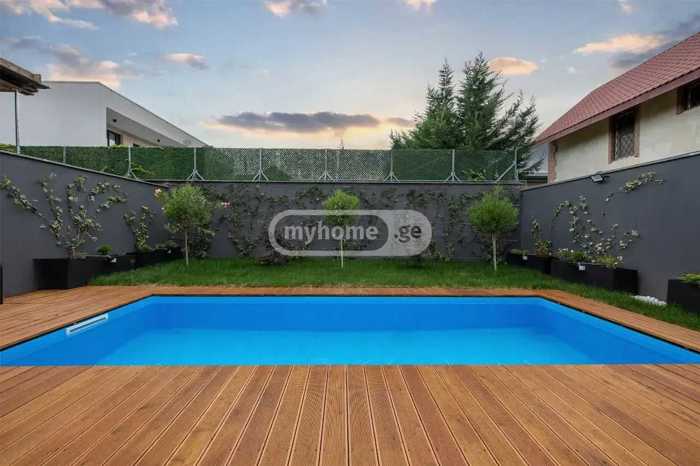 For sale is a newly built private house in Digomi 7. Energy-efficient aluminum doors and windows have been used in the renovation works, with a facade made of Belgian wood. Sanitary engineering from Villeroy & Boch and Grohe. In the kitchen, you will find built-in appliances from Bosh and Midea (dishwasher, oven, gas stove, built-in refrigerator, microwave oven). Throughout the house, there are installed built-in cabinets made of MDF oak veneer. There is a pool located at the back of the yard. At the front of the yard, there is a parking space provided for 3 cars. Each room is equipped with a new generation air conditioning system and underfloor heating. The house has a security system, specifically video surveillance with recording functionality. An electric gate with remote closing has also been installed. A smart lock key is mounted on the entrance door of the house. The yard is fully landscaped and equipped with an automatic irrigation system.