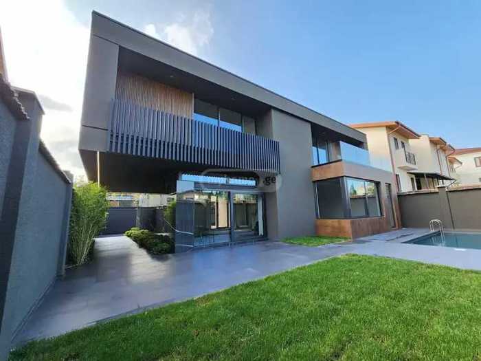 A newly built private house is for sale in Digomi 7. Energy-efficient aluminum doors and windows were used in the renovation work, on a Belgian wooden facade. Plumbing Villeroy & Boch and Grohe. In the kitchen you will find built-in appliances from Bosh and Midea (dishwasher, oven, gas stove, built-in refrigerator, microwave oven). Built-in cabinets with MDF oak veneer are installed throughout the house. There is a swimming pool in the back of the yard. Parking space for 3 cars is provided in the front of the yard. All rooms are equipped with a new generation air conditioning system and underfloor heating. The house has a security system, namely video monitoring with recording function. An electric gate with remote opening and closing has also been installed. A smart lock key is installed on the entrance door of the house. The yard is fully landscaped and provided with an automatic irrigation system.
