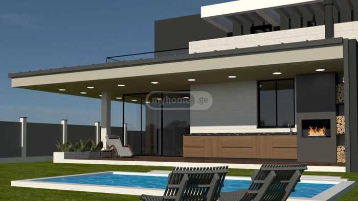 For sale on Didgori Street (village Digomi) a premium class house. The building is a solid concrete structure with a facade finished in expensive wood ('listvinitz'). The pool is finished but requires decoration. The yard has a garage, a technical room, and a shower. The perimeter is equipped with cameras and a security system. The house has three bedrooms, but if necessary, a fourth bedroom can also be arranged. The kitchen is isolated.