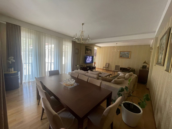 For sale: a private house in Digomi 9, in a quiet and fully developed neighborhood. The house has a clean living area of 250 m2 and includes a living room, a separate kitchen, 4 bedrooms, of which 3 are master bedrooms, a dining room with a fireplace, a wooden kitchen, and its own bathroom, totaling 5 bathrooms and verandas (100 m2). It has a basement/storage and parking space for several cars. The house is of premium quality. All rooms are glazed, providing ample natural light. The yard is fully landscaped and green. The total land area is 640 m2. For more information, please call the provided number.