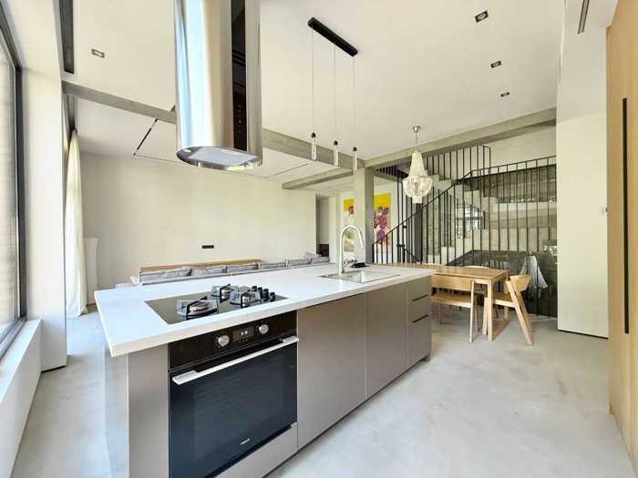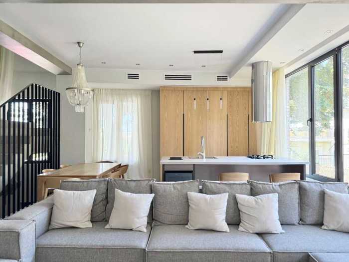 Address: Mtskheta, Georgia Area: 245 square meters house, yard 50 square meters Number of rooms: 5 Bedrooms: 4 (two master bedrooms) living-dining room combined Parking: on the first floor of the house for 2 cars, charger for electric cars Heating: central, floor heating in wet areas and living room Air conditioning: central heating-cooling system, individual remote control in every room Additional benefits: 400-litre water reservoir, power supply for generator (to keep the fridge, heating, WiFi working during power outage), video surveillance system around the house perimeter Wet areas are finished with micro-cement, white oak parquet is laid, the kitchen is also made of white oak material and equipped with Teka appliances Ceiling height: In the garage floor: 2.5 m On the first floor: 3.1 m On the second floor: 2.85
