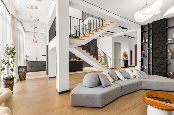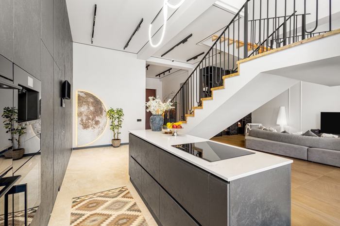 The area of the duplex is 257.4 m2, the roof area is 106 m2. with 2 parking spaces. The house is controlled by a smart system and security cameras.