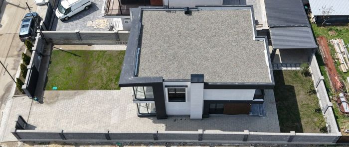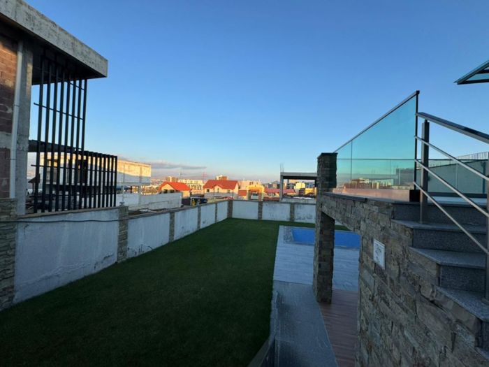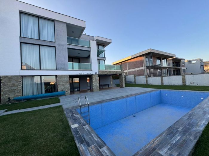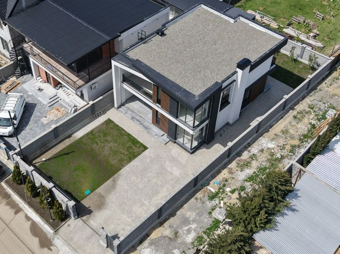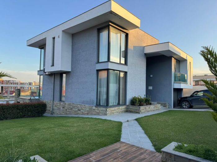 A new modern-style private house is for sale in Zugdidi. The ground floor includes a kitchen, laundry room, pantry, cinema area, changing room, and a wet point for the pool. The first floor features a large living room with a bar, a master bedroom, and a guest wet point. The second floor has three master bedrooms with closet space. There is a garage, a utility room with 2 sinks, and also a pool measuring 10x4 m with heating and filtration system.